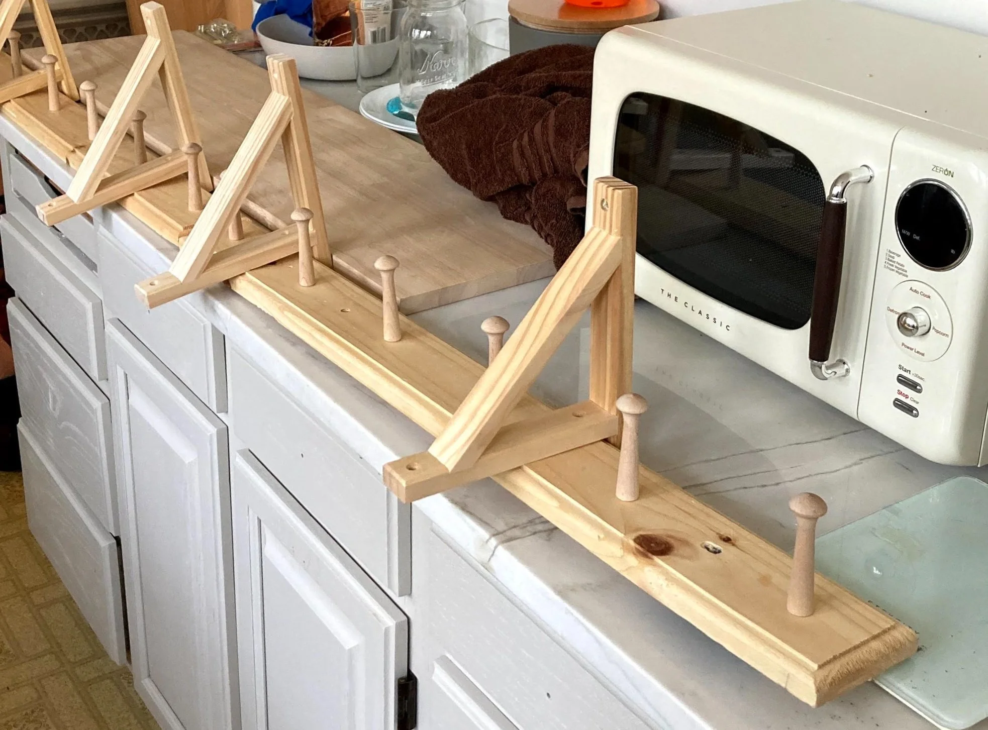 We love using the peg rack to hang our colander, measuring cups, and other kitchen utensils and items.