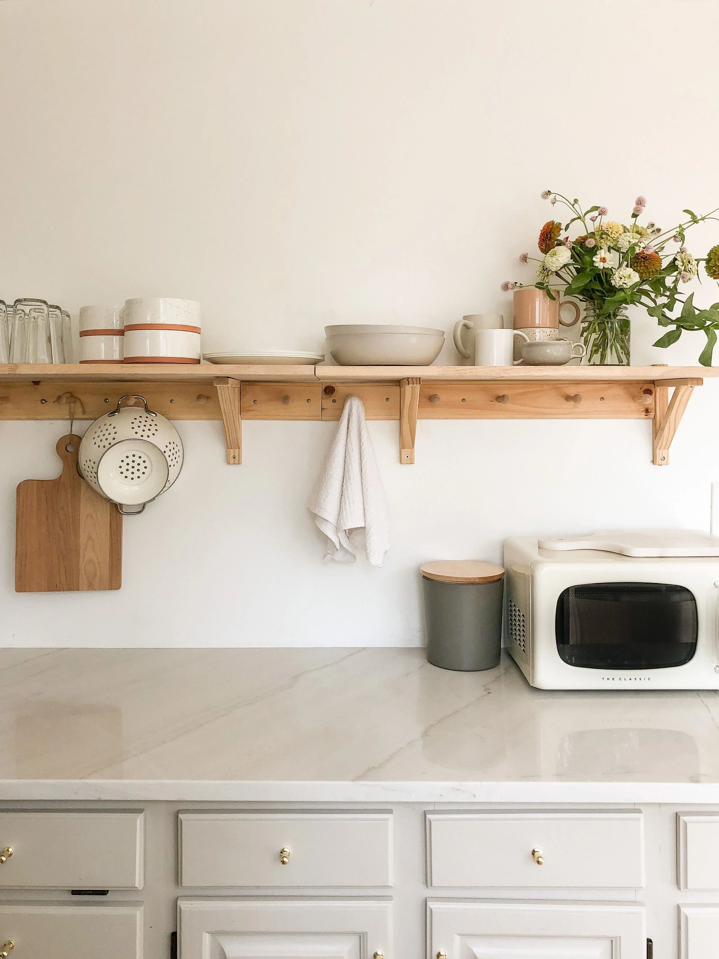 One of the most asked questions I get on Instagram is how we built our wood open-shelving. When we renovated the kitchen, we decided to create a custom peg rack shelf. We were able to create it for super inexpensive and without the work of having to create an entire peg rail from scratch to go under the shelf.
