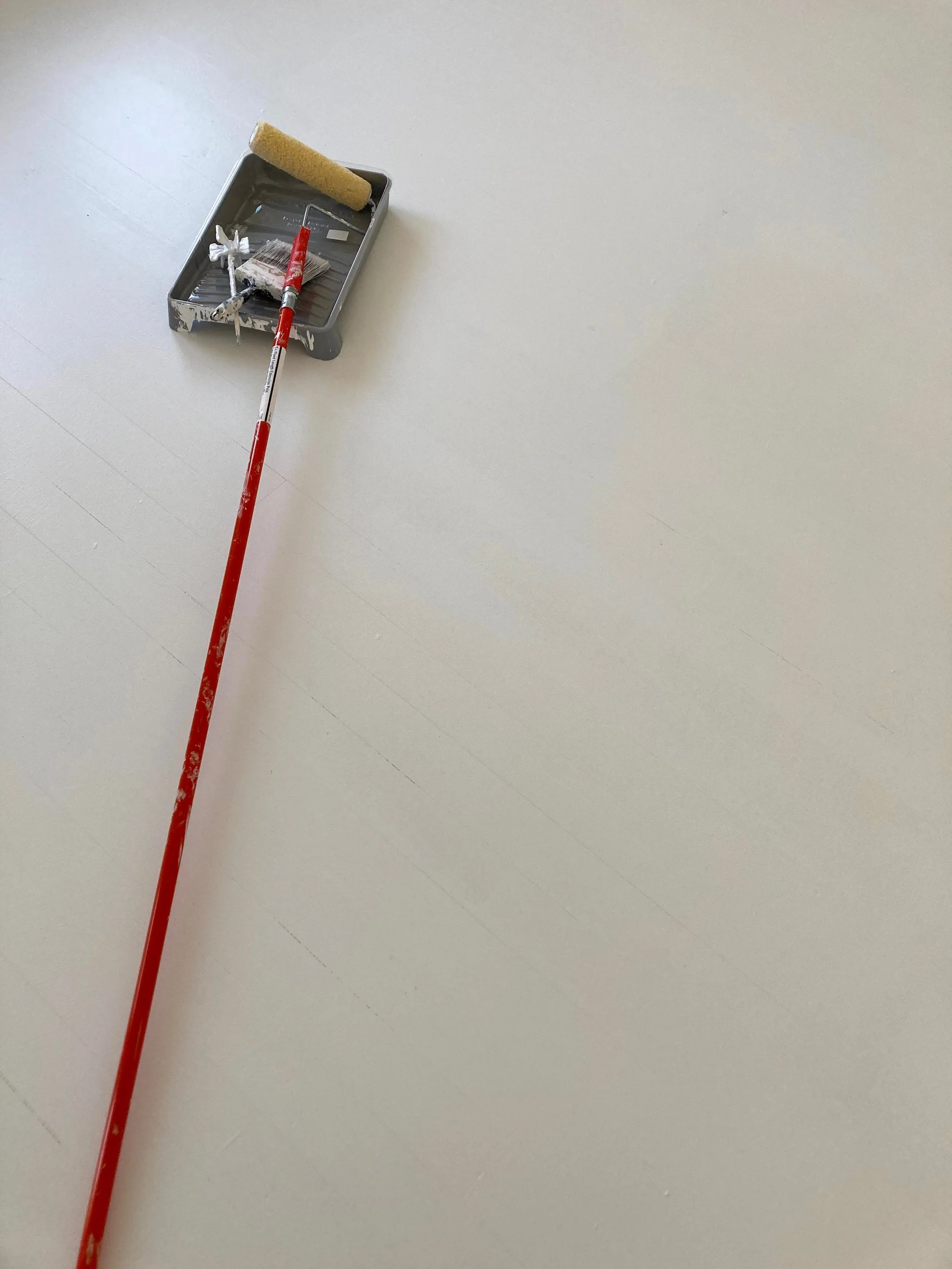 We used this primer on our floors and allowed it to dry for about 24 hours. We found using this roller and an extension pole super useful to cover a large area quickly. Plan an exit strategy so you do not paint yourself into a corner or have to walk over your work!