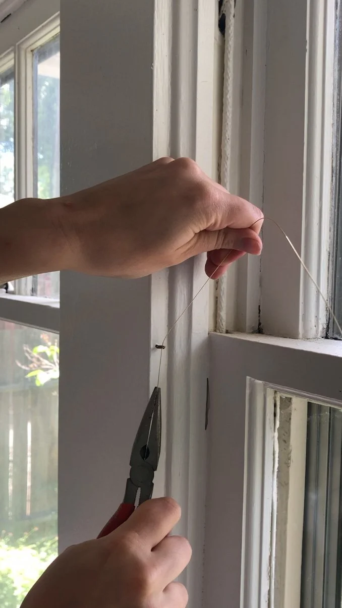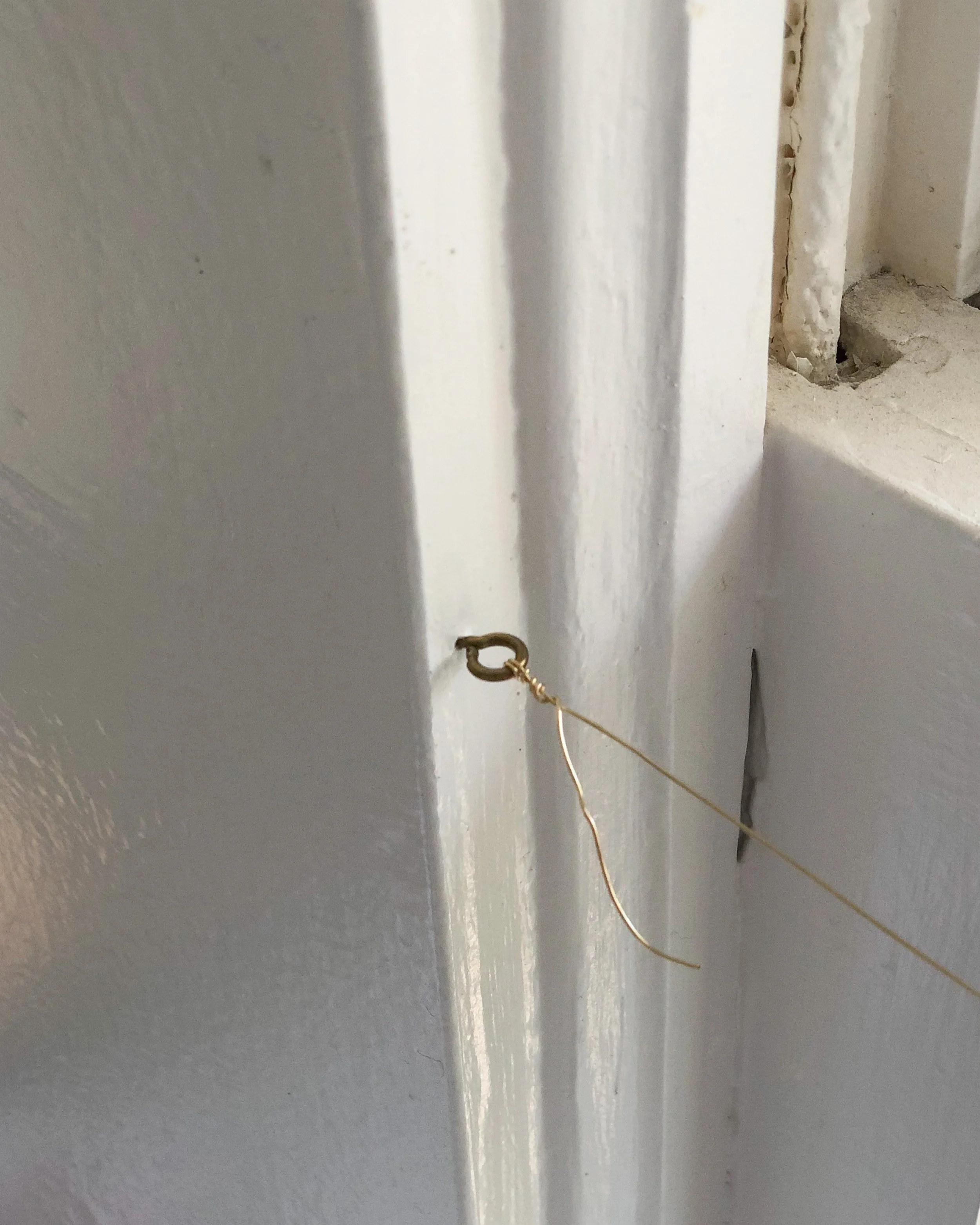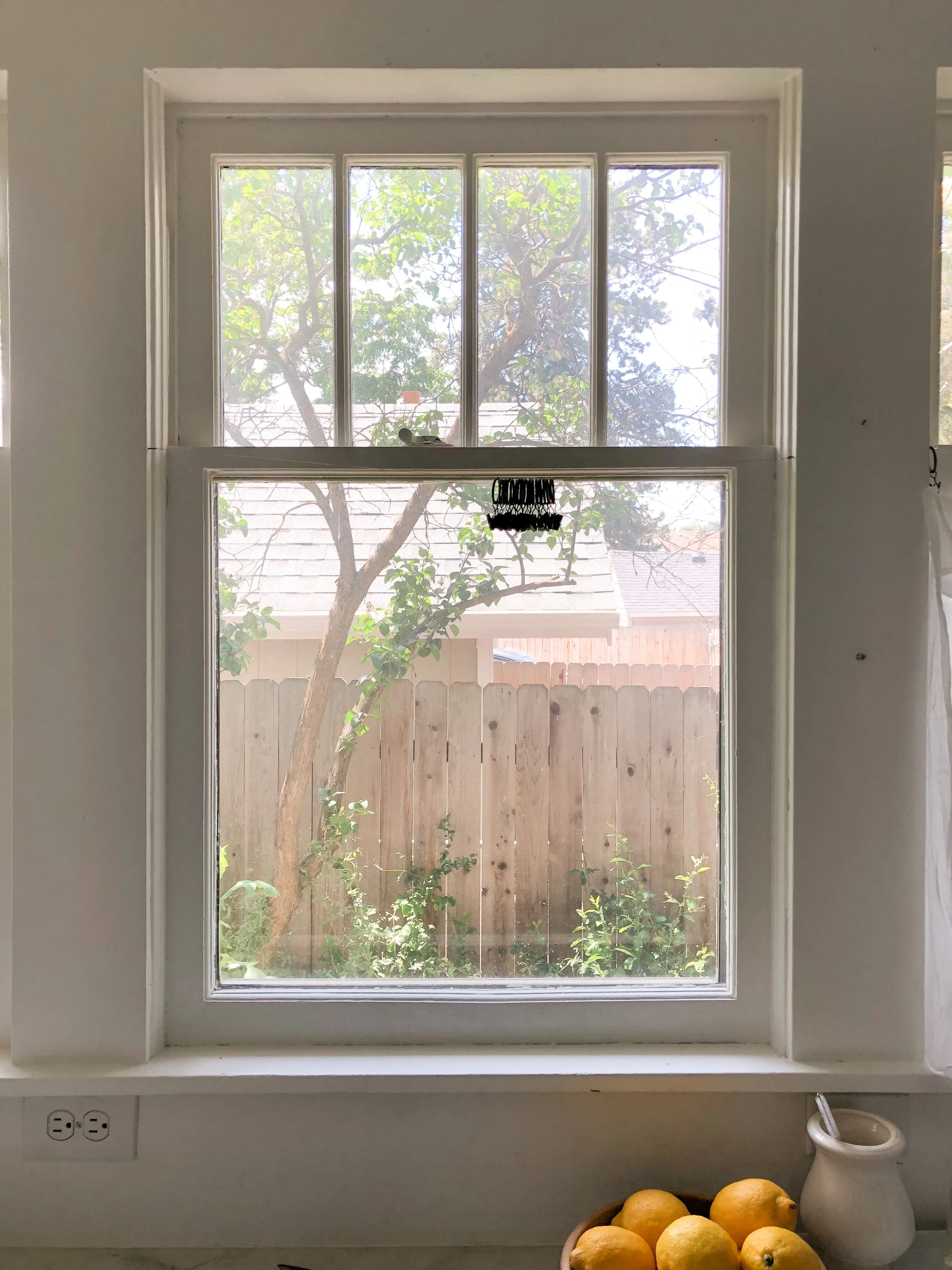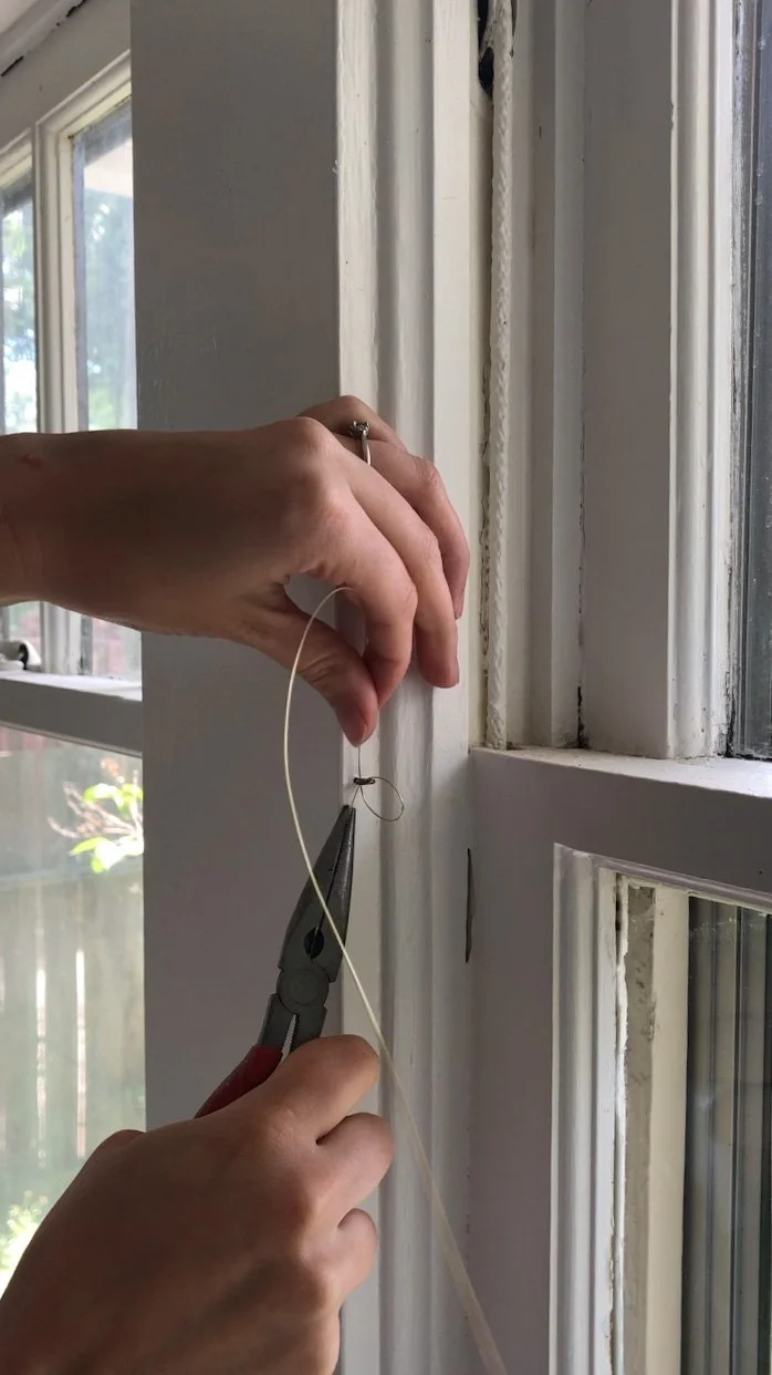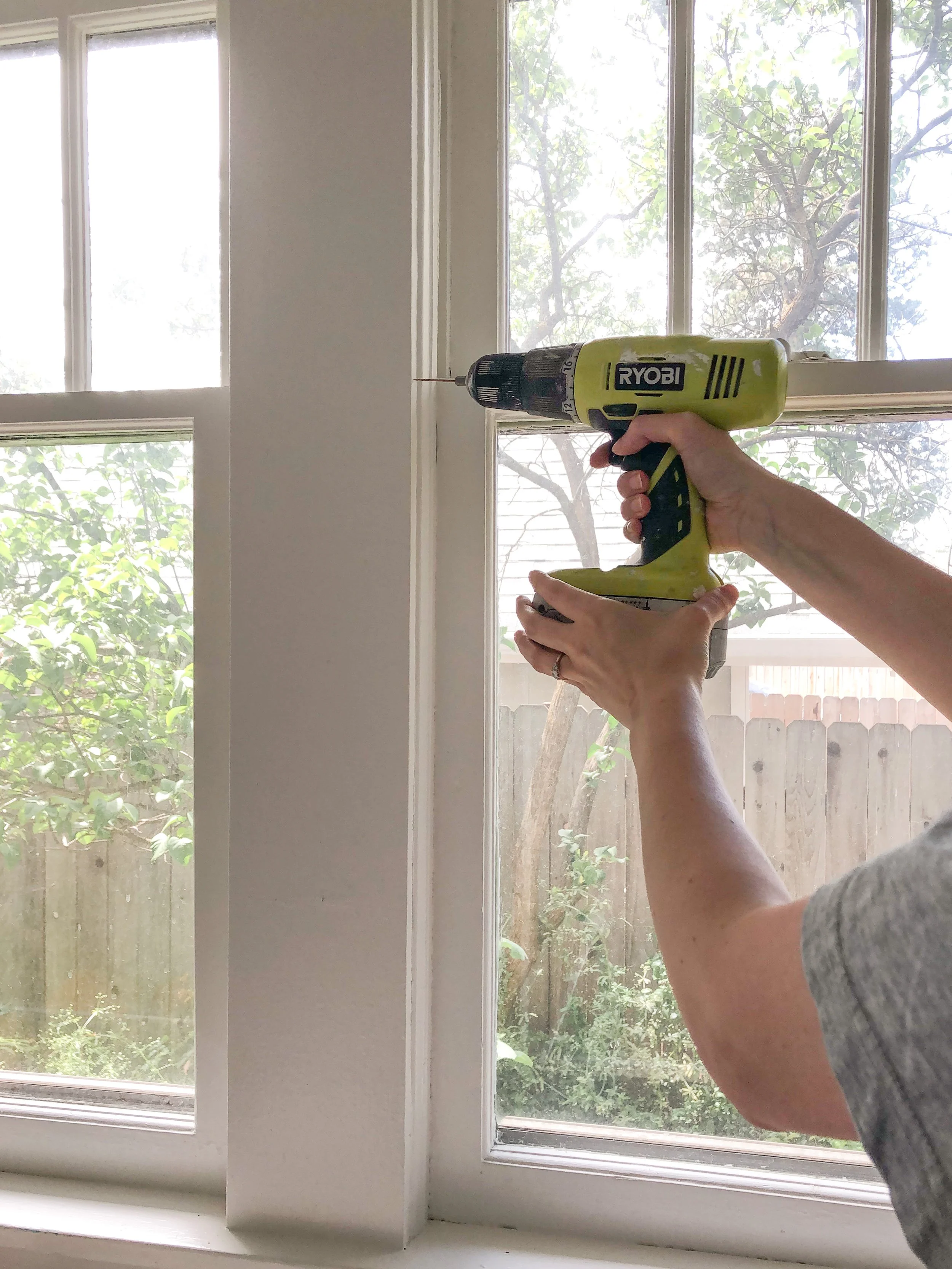 Pre-drill holes for metal eye hooks on either side of the window. I feel like cafe curtains look best when they are run along the section where the window opens so that there are not a ton of dividing sight-lines.