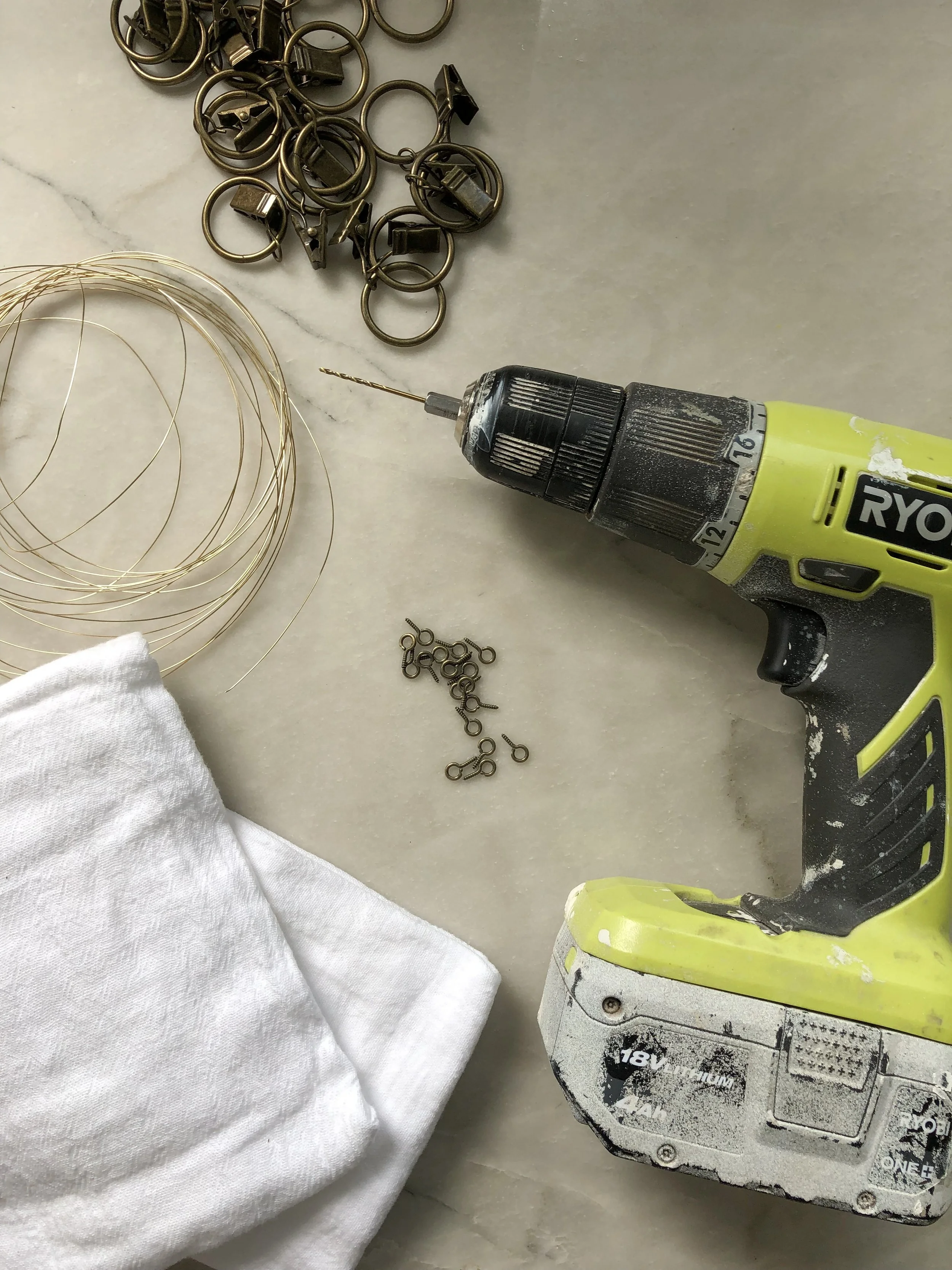 Instead, I decided to use some of my favorite kitchen tea towels as the curtain fabric and eye hooks and wire to hang them. The tea towel fabric filters the light in the prettiest way while still providing privacy and you get a set of ten for only eight bucks from Walmart! I also found these cute curtain rings with clips in the perfect antique brass shade.